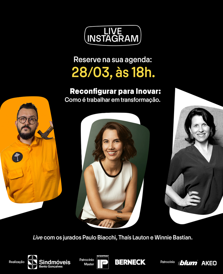 Na reta final para o encerramento das inscrições no Prêmio Salão Design 2023 (o prazo acaba no dia 04 de abril), a premiação realiza uma live com três nomes de peso em seu Instagram (@premiosalaodesign). Nesta terça-feira, 28, partir das 18h, os jurados estético-criativos Paulo Biacchi (designer de produtos), Thaís Lauton (diretora de redação da Casa e Jardim) e Winnie Bastian (curadora e produtora de conteúdo), vão conversar sobre “Reconfigurar para inovar: como é trabalhar em transformação”.