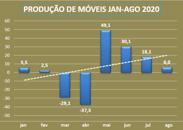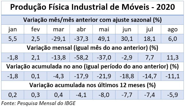 A produção de móveis, nos primeiros dois meses do ano registrou expansão de 8,1% na comparação com dezembro. Sofreu os maiores impactos negativos em março (-29,1%) e abril (-37,3%), mas iniciou uma forte recuperação em maio (49,1%), junho (30,1%), julho (18,1%) e continuou em agosto com alta de 6%.
