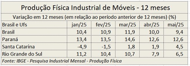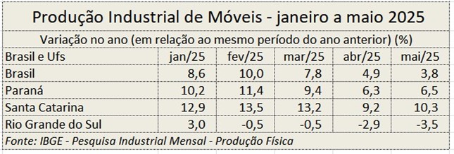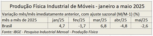 A pesquisa mais recente do IBGE mostra que a produção física de móveis em maio foi um pouco melhor (ou menos ruim) do que a do mês imediatamente anterior, como se vê no quadro: