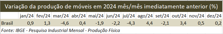 A análise de 2024 mostra oscilação mês a mês, como se vê no quadro abaixo, com quedas maiores em março e julho. Assim, os bons resultados em agosto e outubro não conseguiram reverter a queda do ano que ficou em 1,3%.