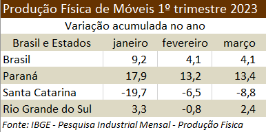 Diferente do que ocorreu no primeiro trimestre de 2022 quando a produção de móveis fechou em queda superior a 5%, os três primeiros meses de 2023 são positivos para as indústrias do setor no País com expansão de 4,1% no nível de produção. Na avaliação de março na comparação com fevereiro a alta foi de 4,2% depois de registrar queda em fevereiro na comparação com o mês imediatamente anterior. A maior alta nesta base de comparação aconteceu em janeiro com 9,2% sobre dezembro.