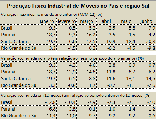 Desde que começou a ter os índices de produção de móveis divulgados pelo IBGE, em janeiro de 2022, Santa Catarina vem liderando a queda nos três estados do Sul este ano. O índice acumulado até junho alcança -14,5% na comparação com igual período do ano anterior.