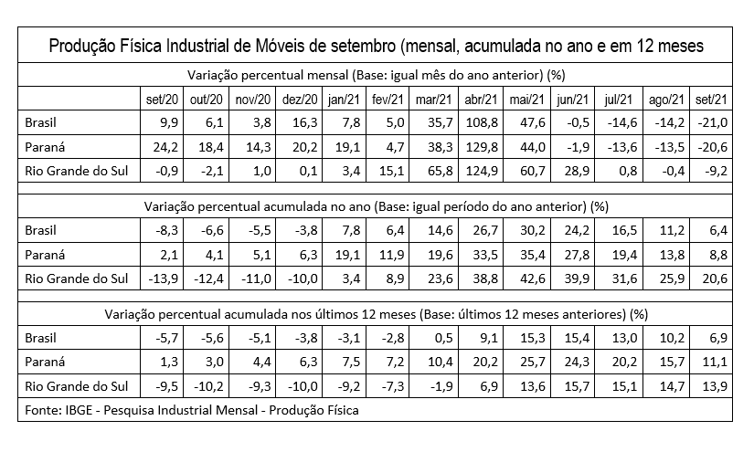 O IBGE pesquisa a produção de móveis nos estados do Paraná e Rio Grande do Sul, sem ajuste sazonal. E nesta base de análise, o Rio Grande do Sul apresenta um desempenho melhor que o Paraná, recuperando as perdas de 2020. O Paraná fechou o ano passado com alta de 6,3% em relação a 2019 enquanto o Rio Grande do Sul encerrou o ano com queda 10,0%.