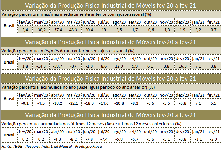 Com o desempenho de fevereiro, a produção de móveis acumulada nos primeiros dois meses do ano registra alta de 5,5% em relação a janeiro e fevereiro de 2020. Já na comparação de 12 meses, a queda é de 2,9%, pouco menor do que a verificada nos 12 meses encerrados em janeiro, que era de 3,1%.