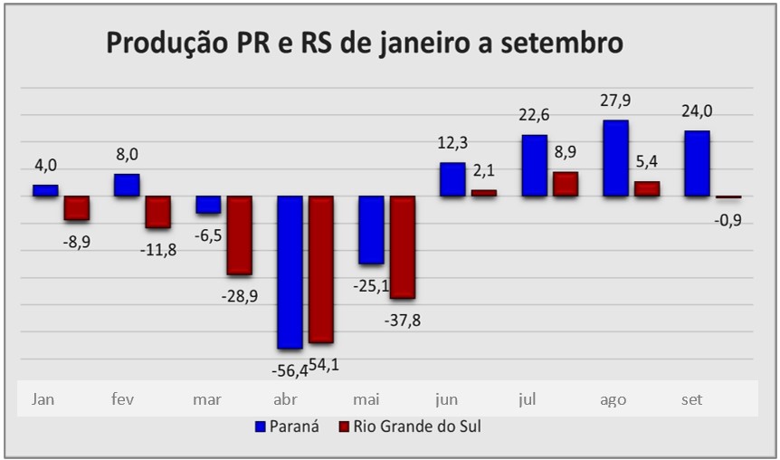 Veja abaixo o gráfico que mostra a variação da produção mês a mês no Paraná e no Rio Grande do Sul, com dados do IBGE: