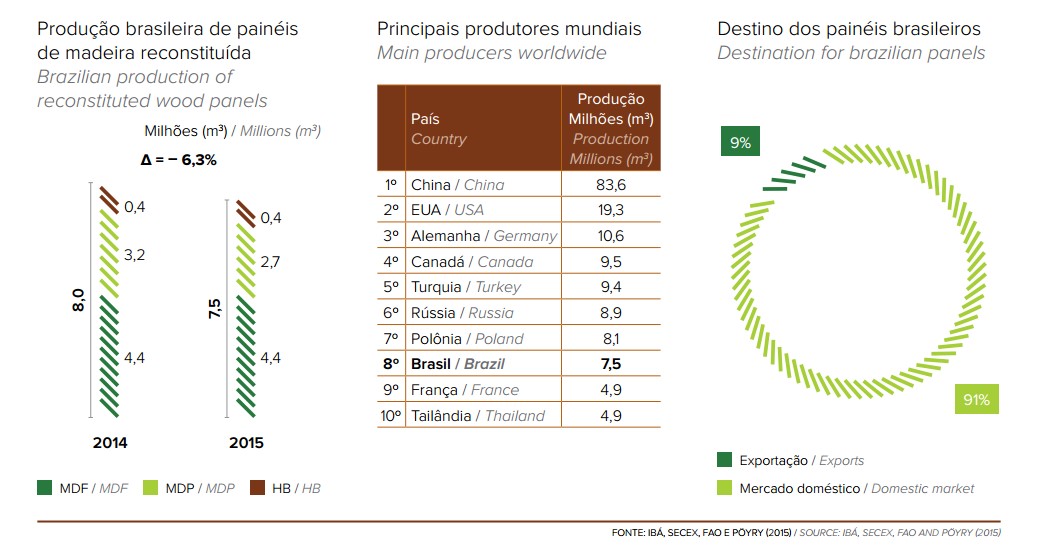 Segundo os dados divulgados no relatório 2016 da IBÁ (Indústria Brasileira de Árvores) publicado no final de julho, em 2015, a produção de painéis de madeira reconstituída foi de 7,5 milhões de metros cúbicos, uma redução de 6,3% em relação a 2014. As produções de MDF/HDF, MDP e de chapas de fibras (HB) diminuíram 0,8%, 14,9% e 0,4%, respectivamente. A diminuição do consumo das famílias levou à redução na compra de diversos produtos, incluindo móveis, o principal segmento consumidor de painéis de madeira no Brasil e cuja retração nas vendas em 2015 foi de 16,2% em volume.