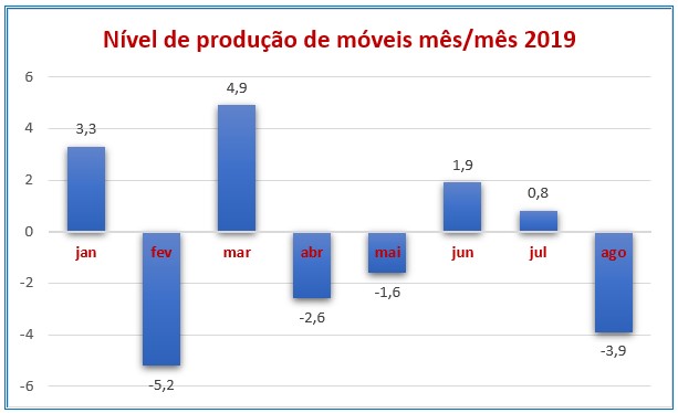 A oscilação nos números de produção de móveis observada ao longo de oito meses deste ano deixa antever que a indústria moveleira pode fechar mais um ano no vermelho, ou seja, com queda na produção em relação ao ano anterior. Em agosto, na comparação com o mês imediatamente anterior, o recuo chegou a 3,9%, revertendo a alta de 0,8% verificado em julho na mesma base de comparação.