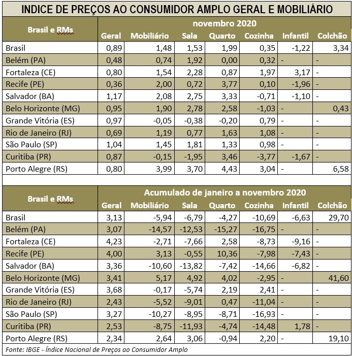 Por segmento, de janeiro a novembro, a maior deflação ocorreu em móveis para cozinha com -10,69%, seguido pelos móveis de sala (-6,79%), infantil (-6,63%), e de quarto (-4,27%). Apenas o item colchão registrou alta, com 29,7% no período.