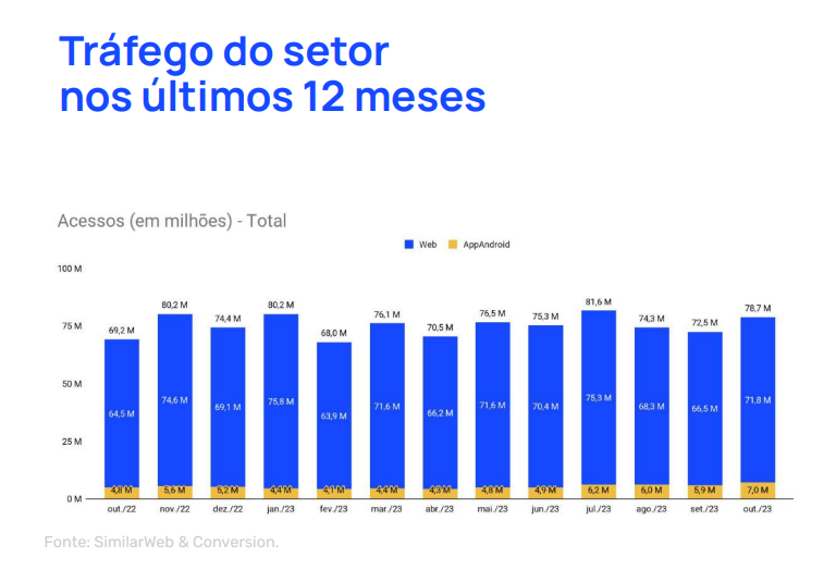 De janeiro a outubro, a média de acessos do e-commerce no país é de 2,5 bilhões por mês. No melhor momento de 2023, 2,6 bilhões de visitas foram registradas, em julho.
