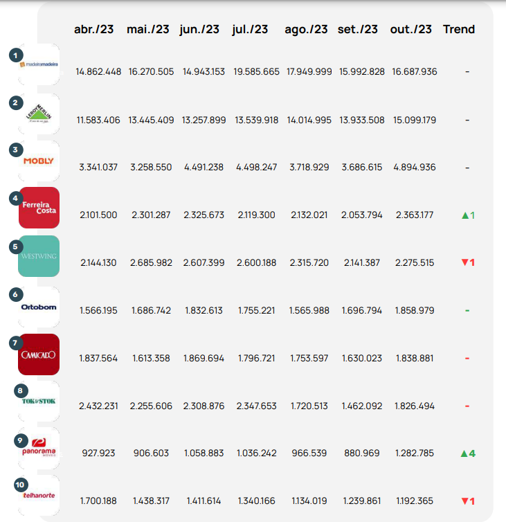 Quem se destacou em outubro foi a Panorama Móveis, que teve crescimento de 45,6% e subiu quatro posições no ranking de acessos do setor, alcançando a 9ª colocação. Também subiu no Top 10 das mais acessadas a Ferreira Costa, que agora está em 4º lugar no setor. Enquanto isso, MadeiraMadeira, Leroy Merlin e Mobly seguem nas três primeiras posições do ranking respectivamente.