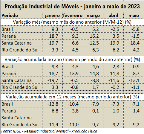 A produção de móveis das indústrias do Sul do país, em maio, registra queda generalizada, com destaque para Santa Catarina, com -18,4%, segundo a pesquisa mensal de produção industrial do IBGE.