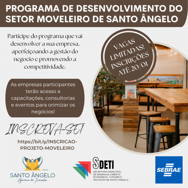 O Governo Municipal, por meio da Secretaria de Desenvolvimento Econômico, Turismo e Inovação e o Sebrae lançaram edital de chamada pública para o credenciamento de micro e pequenas empresas da cadeia moveleira de Santo Ângelo (RS) em um Programa de Desenvolvimento do setor. As empresas têm até o dia 20 de janeiro para adesão e o investimento é de baixo custo para empreendedores.