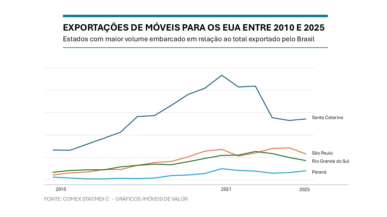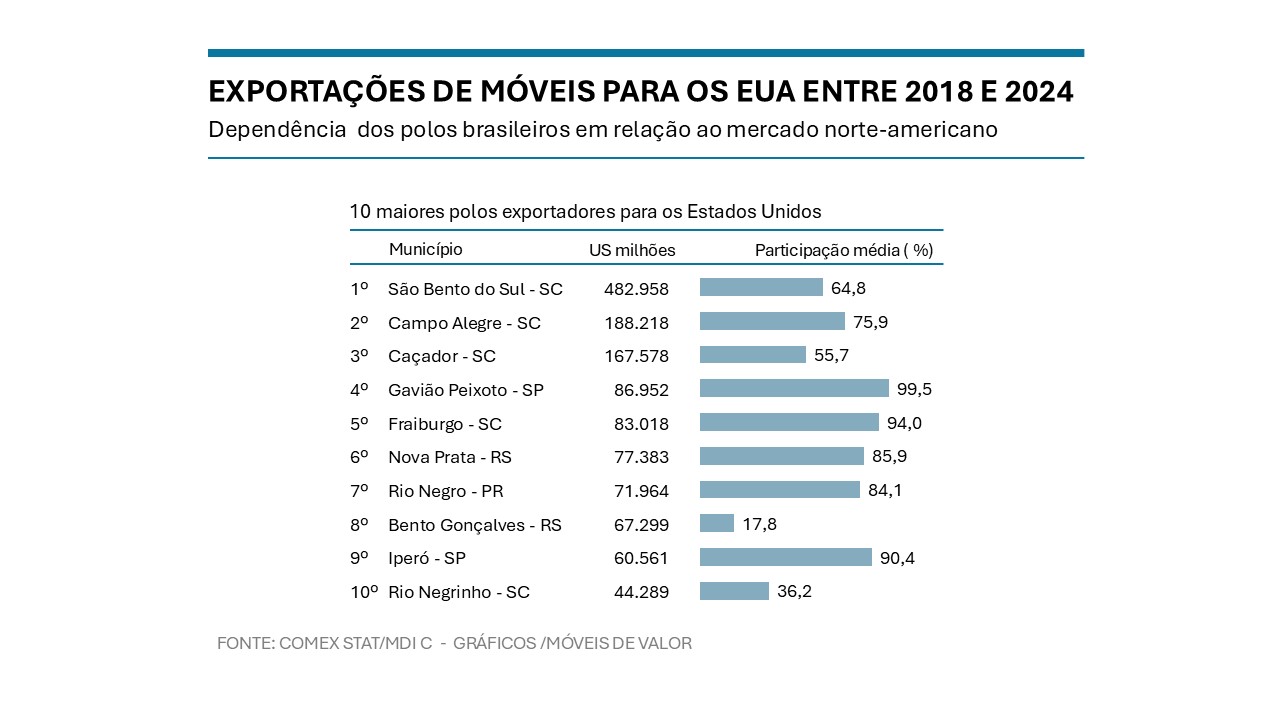 Santa Catarina vendeu aos EUA em 2024 US$ 117,9 milhões, 47% de tudo o que o Brasil enviou. São Paulo aparece na segunda posição (25,4%) e Rio Grande do Sul em terceiro (17,8%). São Bento do Sul, Campo Alegre, Caçador, Fraiburgo e Rio Negrinho são alguns polos que mais serão atingidos com o tarifaço. Na média, concentram entre 36 e 64% de suas vendas para os EUA, contribuindo para que se torne principal mercado do móvel brasileiro.