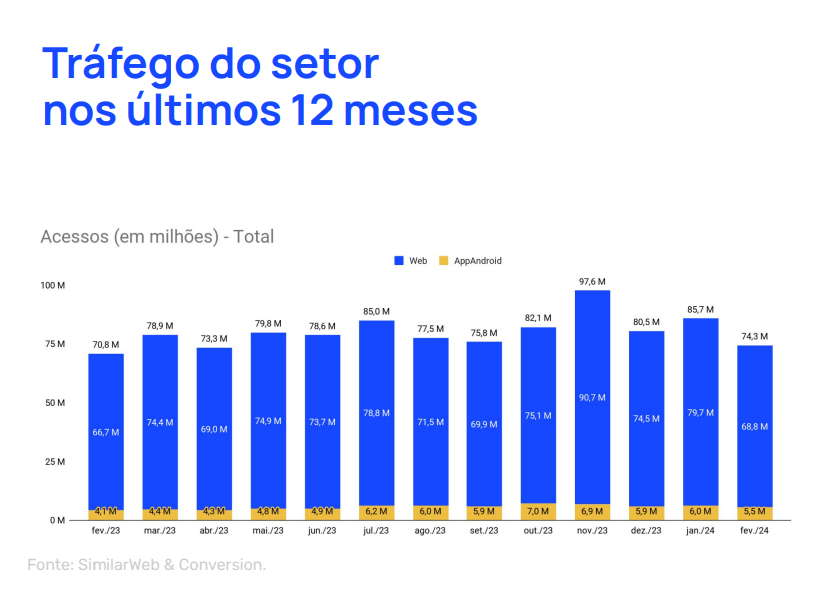 Depois dos bons resultados do final de 2023 e janeiro deste ano, o tráfego do e-commerce seguiu a tendência esperada para fevereiro e caiu 12,3% na comparação ao mês anterior, somando 2,340 bilhões de visitas únicas, de acordo com os resultados divulgados pelo último Relatório Setores do E-commerce Brasil, da Conversion. O número é 1,2% menor do que o de fevereiro de 2023, quando os acessos também haviam caído após o desempenho positivo de janeiro.