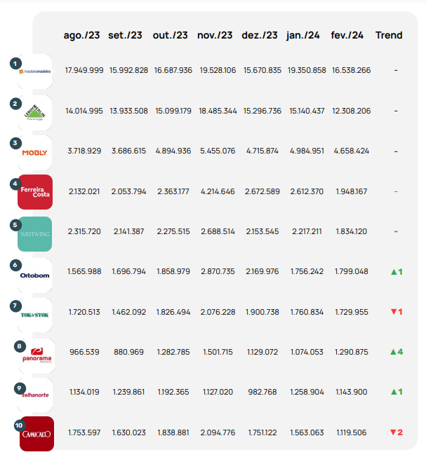 Quem também se destacou foi a Ortobom, que conseguiu subir uma posição no ranking das mais acessadas e agora ocupa a 6ª colocação. O que nunca muda é o topo desse ranking, ocupado sempre pela MadeiraMadeira, seguida por Leroy Merlin e Mobly, respectivamente.