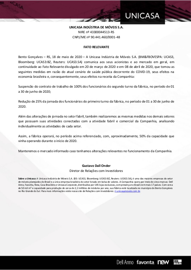 A Unicasa suspendeu o contrato de trabalho de 100% dos funcionários do segundo turno da sua fábrica em Bento Gonçalves, no Rio Grande do Sul, no período de 01 a 30 de junho, mostra fato relevante divulgado na segunda-feira (18).