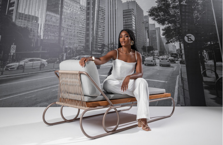 Já o banco Falésias, assinado por Aciole Félix, é inspirado na beleza imponente das falésias que emergem das águas azuis do oceano. Com uma estrutura sólida e linhas elegantes, simboliza o equilíbrio entre o ambiente construído e a serenidade natural ao redor. Félix também assina a cadeira Riva, que combina o dinamismo urbano com a serenidade da natureza. Inspirada pelo significado italiano de "riva", que remete às margens de um rio ou lago, este mobiliário oferece conforto e elegância em um design contemporâneo com elementos naturais.