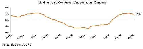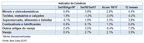 O indicador Movimento do Comércio, que acompanha o desempenho das vendas no varejo em todo o Brasil, subiu 0,5% em setembro na avaliação mensal dessazonalizada, de acordo com os dados apurados pela Boa Vista SCPC. No acumulado em 12 meses, o indicador avançou 3,9% (outubro de 2017 até setembro de 2018 frente ao mesmo período do ano anterior). Já na avaliação contra setembro do ano anterior o varejo cresceu 2,7%.