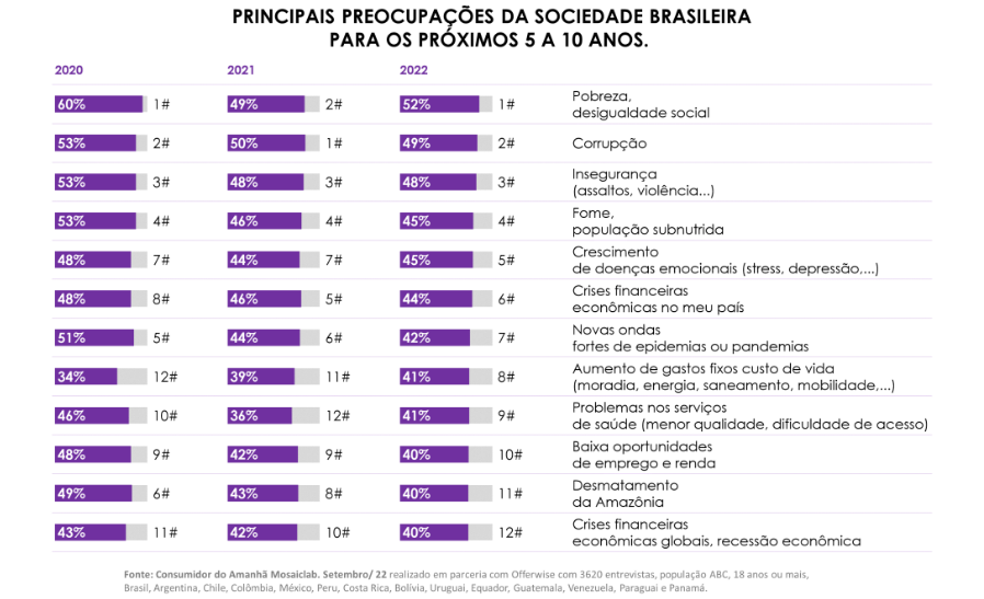 Os quatro pontos que mais preocupam a sociedade seguem os mesmos nos últimos três anos de monitoramento deste indicador realizado pela Mosaiclab no estudo Consumidor do Amanhã: