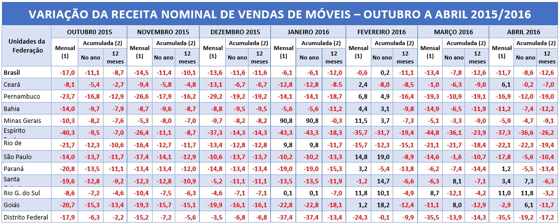 O comércio de móveis continua oscilando no terreno negativo, embora com alguns pontos positivos como é o caso do Ceará, Paraná, Santa Catarina e Rio Grande do Sul onde operou em abril com taxas positivas em receita nominal de vendas (tabela 1). Os piores resultados ocorreram novamente no Espírito Santo com -37,3%, Distrito Federal, com -35,5 e Rio de Janeiro com -22,1%. A média no País ficou em -11,7%. Em volume de vendas, os resultados positivos ficaram apenas com Ceará e Rio Grande do Sul (tabela 2). A maior queda, nesta base de comparação, ficou com os mesmos três estados: Espírito Santo (-38,1%), Distrito Federal (-37,2%) e Rio de Janeiro (-20,8%). A média nacional ficou em -14,6%. Os três estados do Sul (Paraná, Santa Catarina e Rio Grande do Sul estão no terreno positivo no ano em volume de vendas e receita nominal de vendas. Mas no acumulado de 12 meses todas as 12 regiões pesquisadas pelo IBGE estão em terreno negativo, tanto em volume de vendas quanto em receita nominal de vendas.