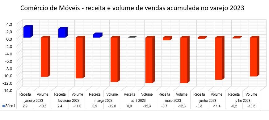 Porém, esta não é a realidade do setor de móveis. Julho fecha novamente com queda significativa quando comparada com igual mês de 2022 (-1,5%) em receita nominal de vendas e -6,8% em Volume de Vendas.