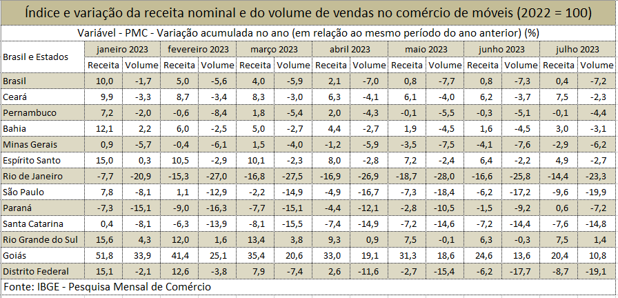 Na mesma base de comparação, o comércio de móveis nos primeiros sete meses deste ano mostra 0,4% de alta na receita e 7,2% de queda em volume.