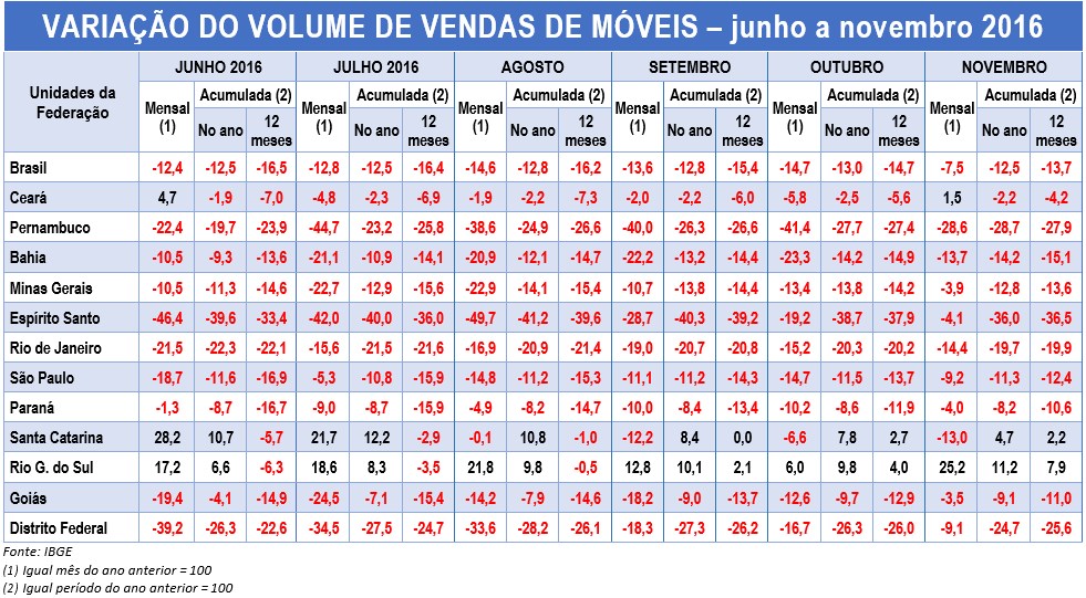 O comércio de móveis seguiu sua trajetória de queda. Na comparação de novembro com o mesmo mês de 2015 a queda foi de 7,5%. Com isso, o volume de vendas acumulado no ano caiu 12,5% e nos últimos 12 meses o recuo chega a 13,7%.