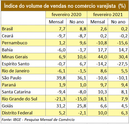 Entre as 12 regiões pesquisadas pelo IBGE, a maior alta em fevereiro ocorreu em Minas Gerais, com 44% na comparação com igual mês do ano anterior. E, note que o estado mineiro havia registrado alta de 6,9% no segundo mês do ano passado na comparação com igual período de 2019. Em segundo está o Rio Grande do Sul, com 18,1%, seguido da Bahia com 17,7%. Porém, ambos vêm de resultados negativos na base de comparação (fevereiro de 2020), de -21,3% e 6,0%, respectivamente.