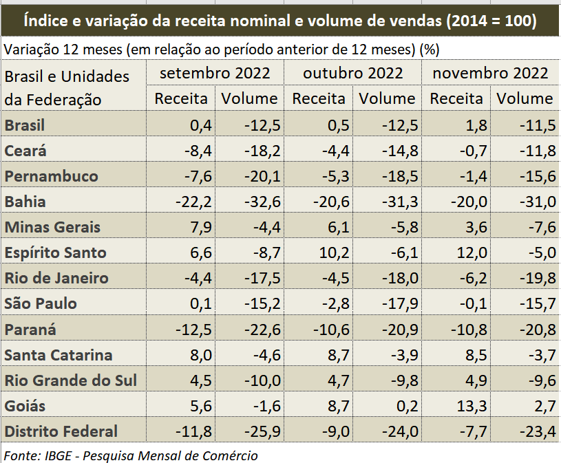 Do outro lado está Santa Catarina, com resultados positivos na casa de 8% em receita nominal de vendas.