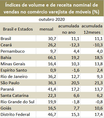Com o resultado de outubro, o volume de venda de móveis no varejo brasileiro, nos primeiros 10 meses do ano, supera em 11,1% o volume do mesmo período do ano passado.