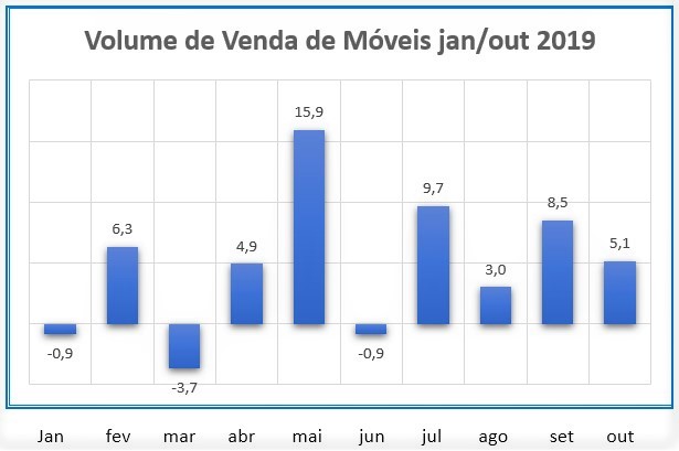 E as vendas de móveis em outubro também apresentaram resultado positivo, menor, é verdade, do que em setembro quando a alta chegou a 8,5% na comparação com setembro de 2018, mas os 5,1% verificados em outubro na mesma base de comparação, elevou de 4,6% para 4,7% o volume de venda de móveis no varejo nos primeiros 10 meses deste ano. Em outubro do ano passado a taxa anual estava com queda de 1,1%.