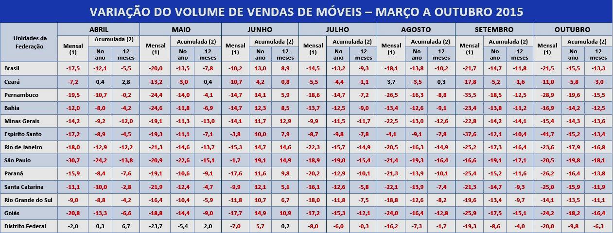 Em outubro, a maior queda na receita nominal de vendas de móveis ocorreu no Espírito Santo com -40,3%, enquanto o Ceará registrou a menor taxa com -8,1%. No acumulado do ano a queda mais acentuada foi registrada em Pernambuco com -16,8% e a menor de novo no Ceará com -5,4%. E nos últimos 12 meses a maior redução na receita de vendas foi verificada em Goiás com -13,4% e a menor foi registrada no Distrito Federal com -2,2%.