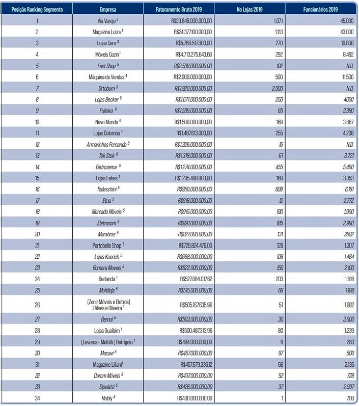 A edição 2020 do Ranking das 300 Maiores Empresas do Varejo Brasileiro, índice da Sociedade Brasileira do Varejo e Consumo (SBVC), apresenta 34 empresas do setor de Eletromóveis, que somam um faturamento bruto de R$ 94,291 bilhões, o equivalente a 13,41% das vendas totais das 300 maiores empresas.