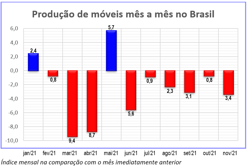 Com apenas dois meses em terreno positivo na comparação com o mês imediatamente anterior, não havia condições da produção de móveis se sustentar em 2021 na comparação com o ano anterior. É fato que as piores quedas ocorreram em março e abril, houve pequena expansão em maio, mas o segundo semestre não teve fôlego para alterar o quadro, como se vê no gráfico abaixo.