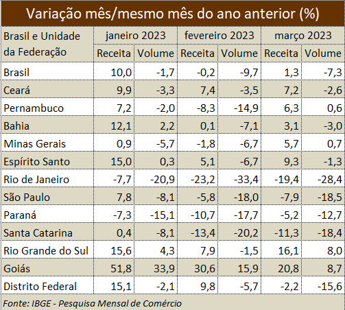 A pesquisa mensal de comércio do IBGE mostra que as vendas de móveis no varejo continuam negativas, mas observa-se uma leve melhora de 2,4 pontos percentuais na comparação entre fevereiro e março deste ano e de 2022 (veja quadro completo abaixo). É pouco, mas é uma sinalização importante, considerando que as vendas vinham ladeira abaixo desde 2022 quando fechamos o ano com recuo de 11,1% no volume de móveis vendidos no varejo.