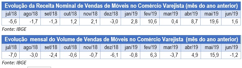 Nos indicadores de receita nominal de vendas, os resultados vieram melhores, o que é comum, tendo em vista a variação da inflação. A receita com a venda de móveis no varejo em junho variou positivamente em 1,6%, na comparação com junho de 2018, bem menos do que os 19,6% verificados na mesma base de comparação no mês de maio.