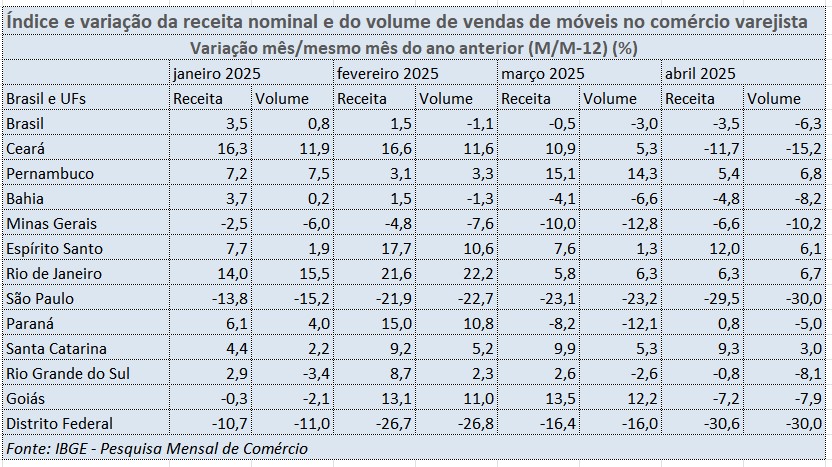 Entre janeiro e abril, segundo a pesquisa mensal de comércio do IBGE, apenas no primeiro mês do ano o volume de venda de móveis registrou alta (0,8%) na comparação com igual mês do ano anterior. Em fevereiro ocorreu a primeira queda com -1,1%. No mês seguinte o recuo se acentuou com -3,0% e voltou a apresentar queda mais acentuada em abril com -6,3%, sempre em relação ao mesmo mês de 2024.