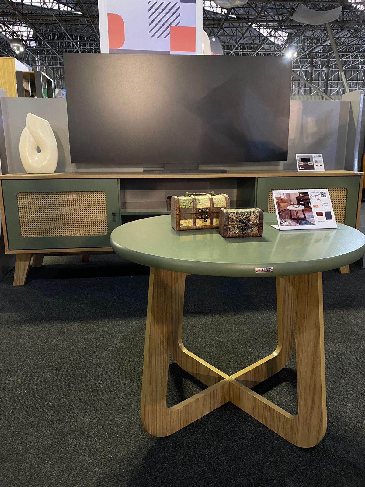 Já a grande novidade da Artely é a cor menta, que está presente na linha Charlotte, um dos grandes sucessos da marca. Ela é composta por rack, buffet, mesa de apoio e agora ganhou também uma mesa de centro 100% MDF. “Apostamos nessa nova cor por ser uma linha já consagrada, que chama atenção pelos seus detalhes em palhinha feita em pintura 3D”, acrescenta Elaine Durante, diretora comercial.